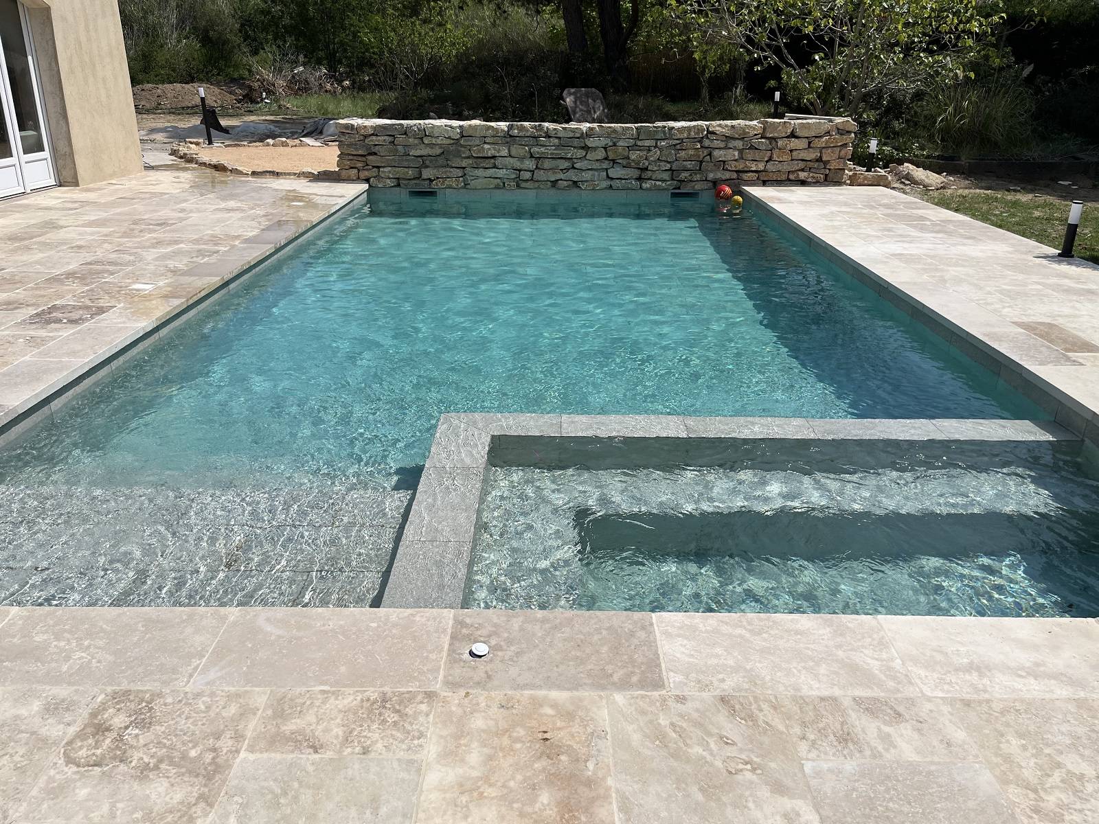 Piscine en carrelage Ocean Bali Grey 30x60 de l'usine Savoia, avec margelles et tour en travertin 40x60, pose réalisée par Les Piscines de Bâti. Cette combinaison de matériaux apporte une élégance naturelle et moderne, sublimant l’espace extérieur avec style et raffinement.